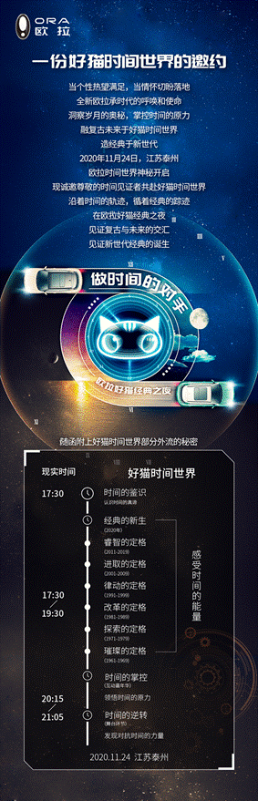 智美潮跑,猫力觉醒!11月24日,主题为“做时间的对手”的欧拉好猫上市发布会,将在位于江苏省泰州市的长城汽车泰州工厂隆重举行。“新世代智美潮跑”欧拉好猫盛情邀约各位“时间见证者”共赴好猫经典之夜,感受复古与未来的交汇,见证新世代经典的诞生!